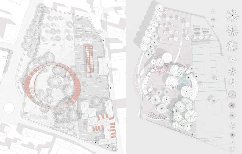 Il carattere pubblico del parco è accentuato dalla rifunzionalizzazione degli ex rustici e dalla creazione di una nuova piazza. «Gli ex rustici sono pensati per ospitare le attività pubbliche aperte a tutta la cittadinanza e costituiscono un polo aggregativo che comprende una foresteria, una caffetteria, una sala di aggregazione». Questi spazi sono in stretta connessione con la nuova piazza interna al lotto.