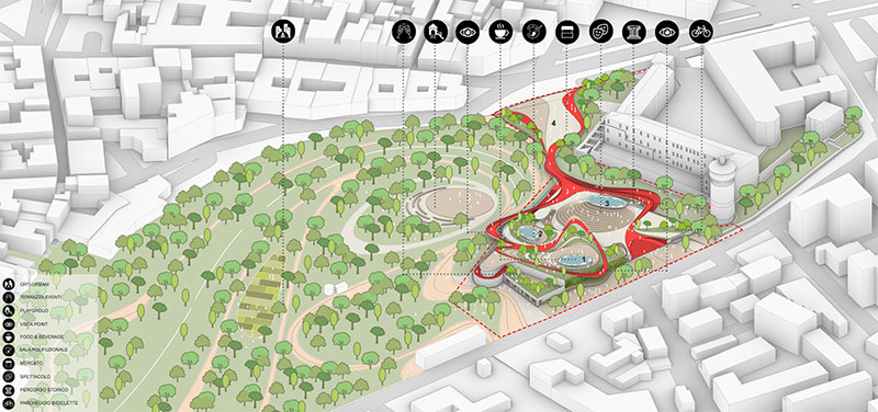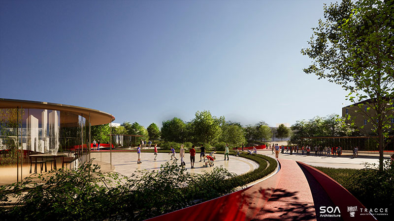 Si tratterà, infatti, di uno spazio eterogeneo, specchio del contesto ospitante, dove il mercato contadino, le aree di svago e intrattenimento, quelle verdi e adibite a orti urbani, le zone adibite a spettacoli serali e quelle destinate al gioco dei più piccoli si incontreranno e si mescoleranno in uno spazio interconnesso e aperto con massimo grado di accessibilità.
