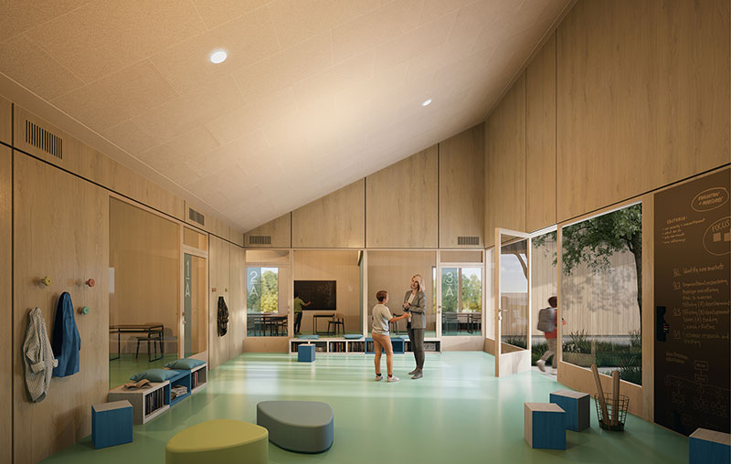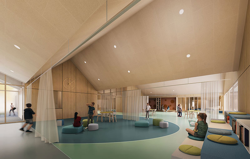 Organizzato come un grande "grappolo" attorno a una piazza, l'istituto scolastico, su un unico livello, offre spazi di maggiore specializzazione - come aule, atelier, laboratori, spazio per l'apprendimento individuale -, aree per il gioco e lo sport e polifunzionali di media specializzazione e alta flessibilità e altri ancora di connessione, che diventano relazionali e offrono diverse modalità per attività informali individuali e di gruppo.