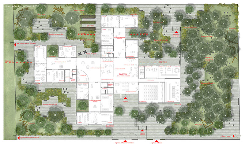 La proposta presentata dal team guidato da Federico Calabrese - elaborata insieme all'architetto Claudio Pia, Gap Progetti Srl, al geologo Federico Berardi con i collaboratori Roberto Cacciapuoti e Robert de Paauw - si sviluppa a partire da un approccio ecologico che, osservando il contesto, dà forma a una scuola integrata, orientata al soggetto, alla sua esperienza di vita e all'esercizio della cittadinanza attiva.