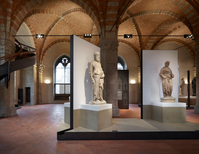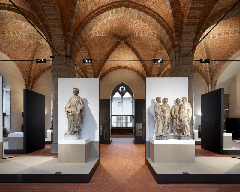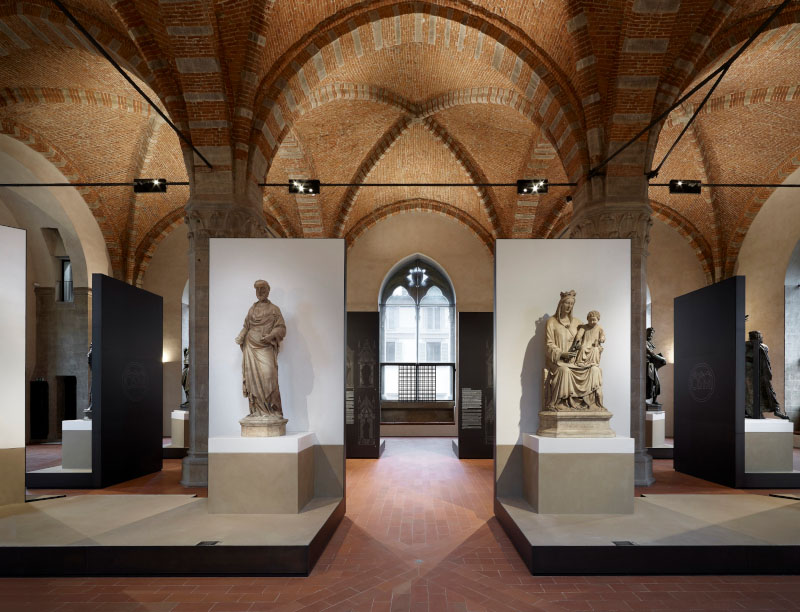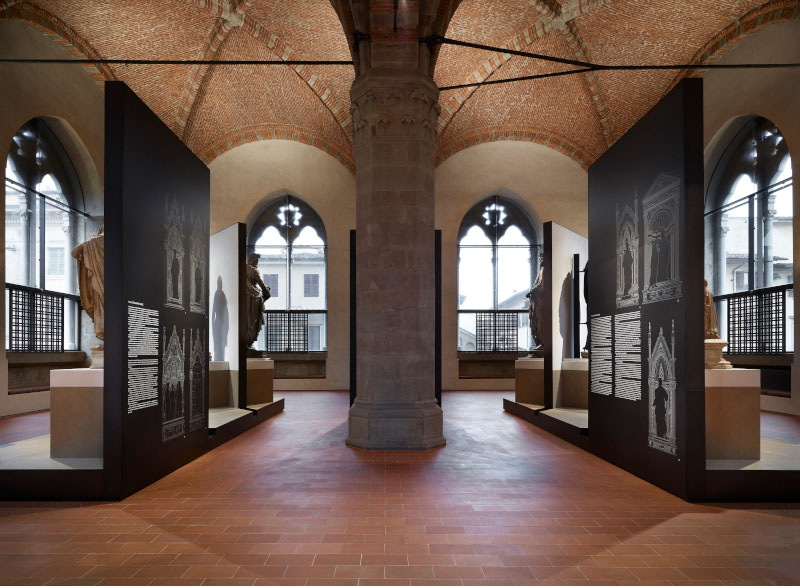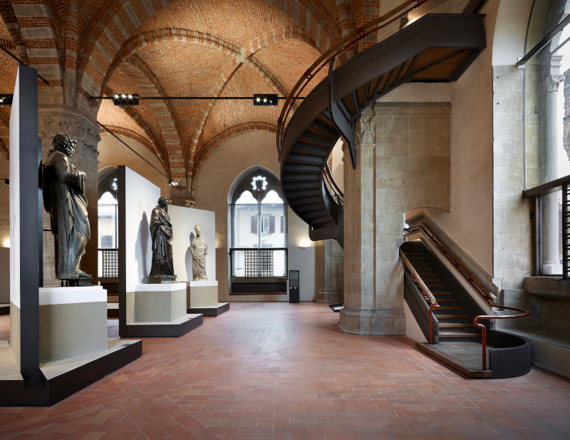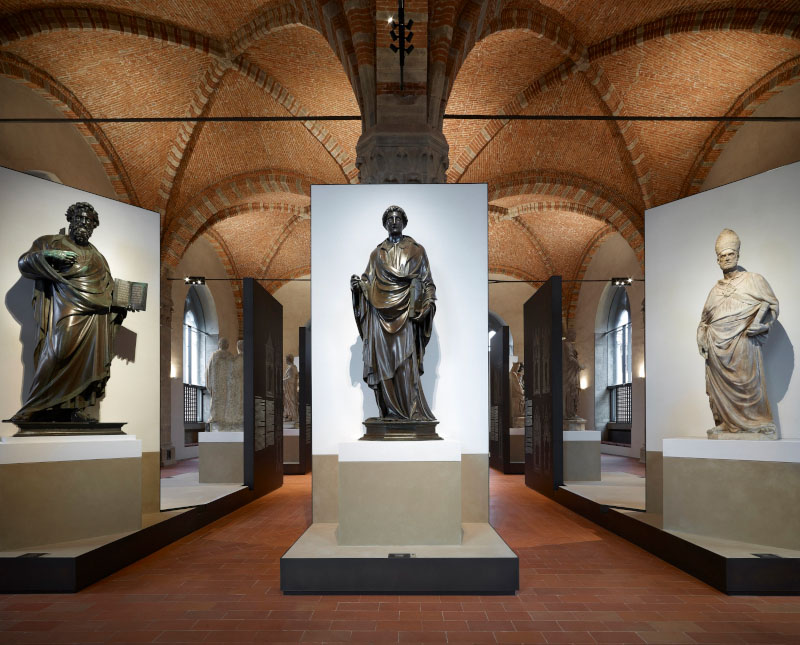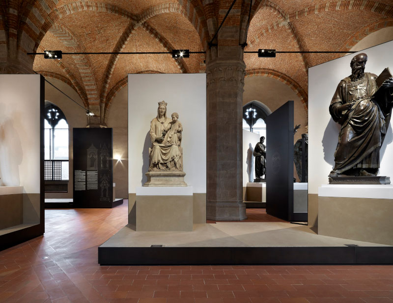 Il progetto, dunque, cerca di riprodurre il rapporto statua-spettatore secondo il punto di vista degli antichi maestri, Donatello in primis, che nell'ideazione delle statue tenevano conto della collocazione finale. «Le sculture pensate e realizzate secondo le regole prospettiche, ai primi del Quattrocento, avevano - spiegano gli architetti - la necessità di essere osservate da una posizione più vicina a quella originale e ricontestualizzate all'interno di un allestimento che, evocando i tabernacoli, le mettesse in un giusto rapporto di scala con le dimensioni dell'ex granaio. Sono nate così delle piccole architetture che accolgono le sculture sollevate su di un podio, a 1,40 metri da terra, e incorniciate da un fondale, alto 4,50 metri, che ripropone l'idea stilizzata dei tabernacoli mettendo in risalto l'opera».