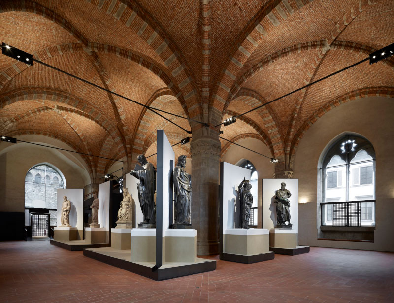 «La matrice geometrica che ordina la posizione delle singole figure attraverso il sistema di pedane - proseguono i progettisti - interpreta così la disposizione delle aperture: dieci bifore marmoree alte sette metri che il progetto di allestimento tiene in conto per dare luogo a un ordito di intervalli e di attraversamenti. In tal modo nel salone viene evocata una passeggiata lungo le strade attorno a Orsanmichele. Le figure dei santi tornano così a interagire con il pubblico, come quando si trovavano nelle nicchie collocate sulle facciate, lungo le strade. La scelta di ruotare le statue collocate in posizione angolare introduce un senso di movimento e contribuisce a esaltare questa dimensione pubblica dando luogo a una sorta di dialogo tra le stesse figure».