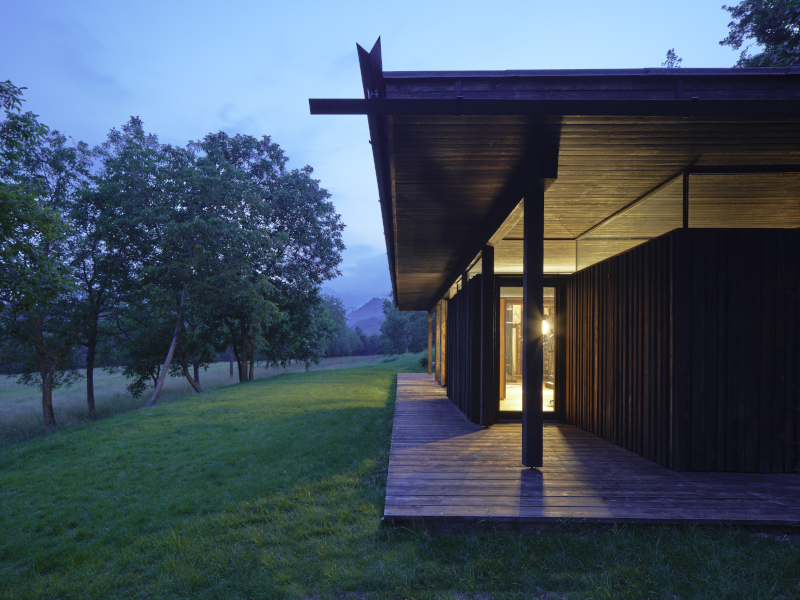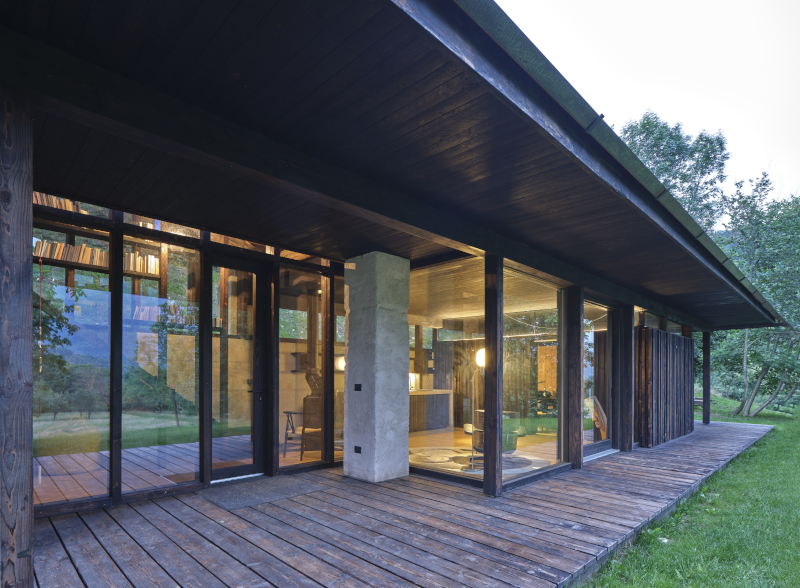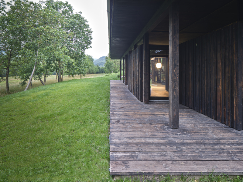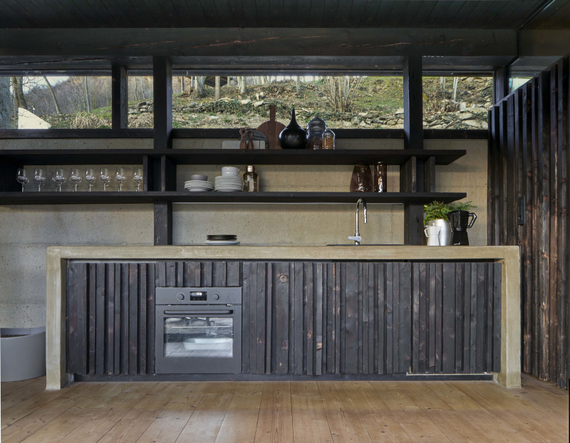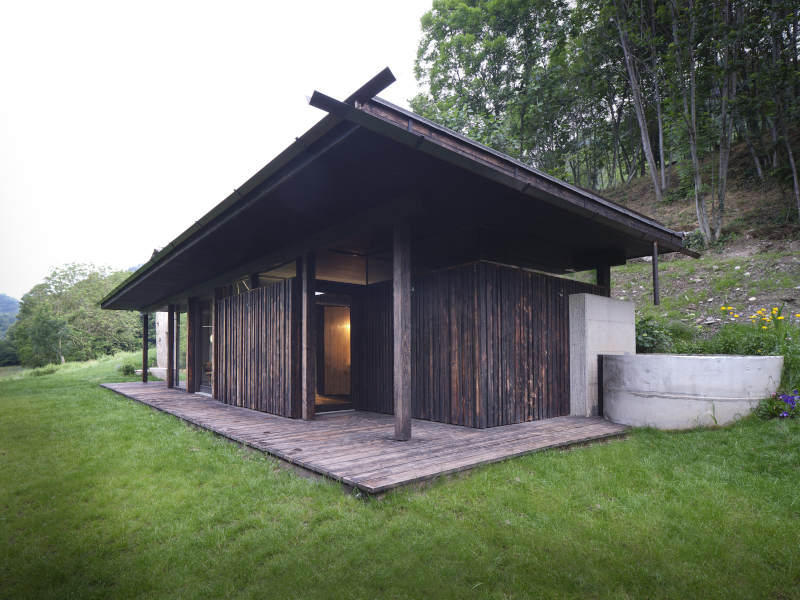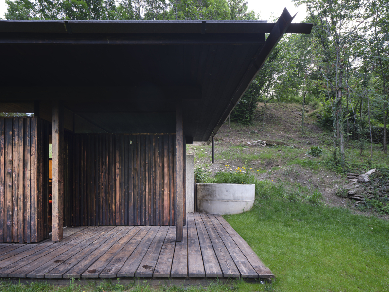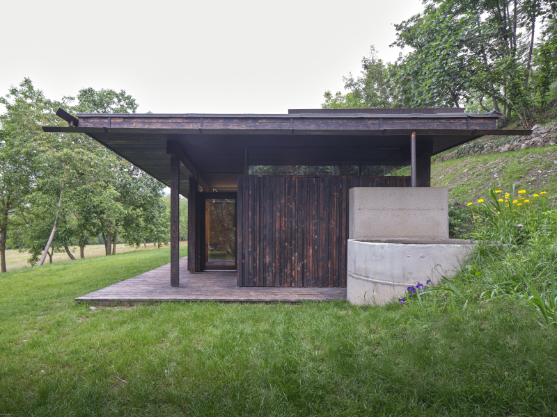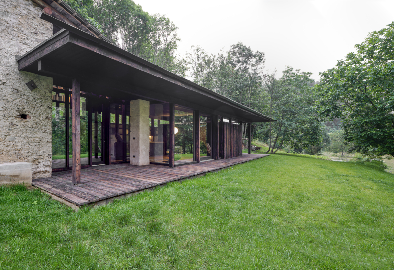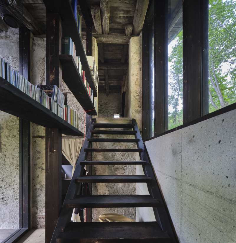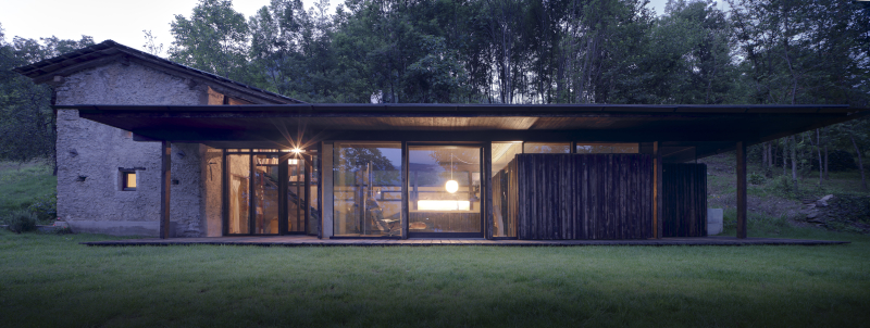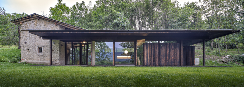 Un rudere abbandonato conquistato dai rovi, immerso nella natura del bosco, diventa una casa-rifugio grazie alla valorizzazione dell'antico luogo di vita contadina e al moderno e misurato ampliamento che utilizza legno di larice bruciato e vetro per dar vita ad un'architettura in simbiosi con il paesaggio.