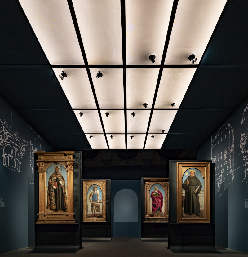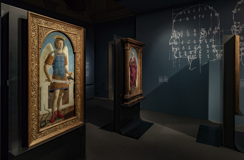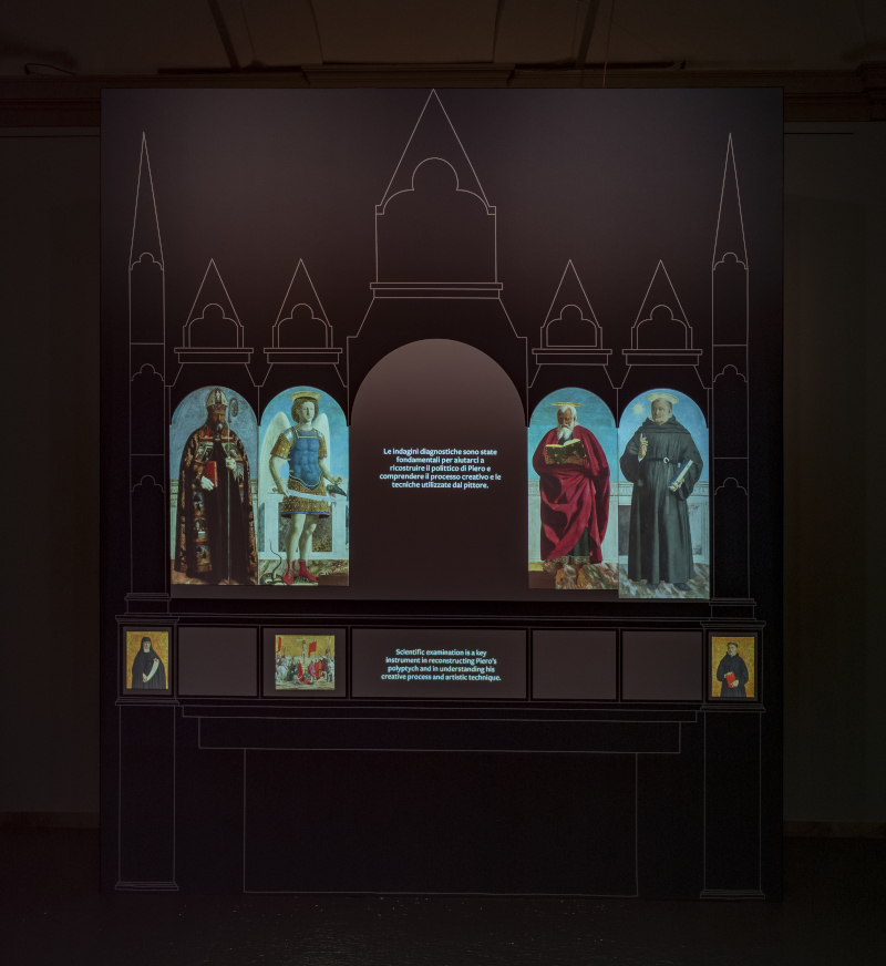 L'installazione di CRA e Italo Rota prova a immergere lo spettatore in un'esperienza unica: guardare il capolavoro riunito attraverso gli occhi di Piero della Francesca. Per farlo i progettisti hanno pensato di provare a «riprodurre l'atmosfera e le condizioni di luce dell'atelier toscano di Della Francesca», spiegano in una nota.