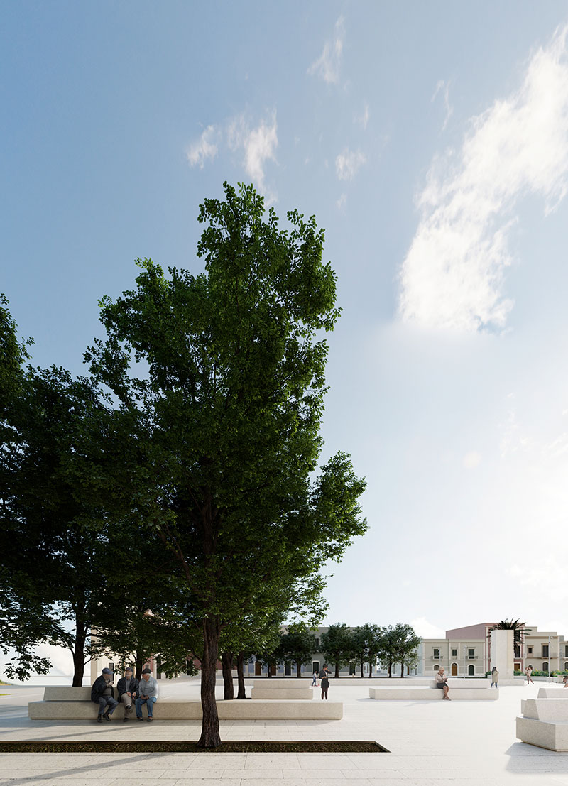 Si configura così il disegno di una piazza aperta, che riscopre le connessioni storiche, fisiche ed immateriali tra alcuni dei punti cardine della cittadina: la Scuola Primaria, la Villa Comunale, e la Chiesa del Carmine.
