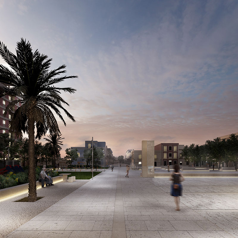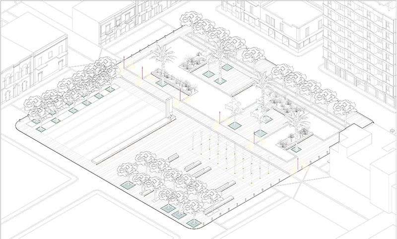 Lo sdoppiamento avviene qui a partire da un integrale ripensamento del vuoto urbano che, se da un lato è inteso come simbolo di aggregazione e socialità, dall'altro si concentra sul fattore estetico attraverso la rifunzionalizzazione degli elementi di arredo urbano, migliorando il microclima con nuove piantumazioni ed essenze mediterranee a basso costo manutentivo.