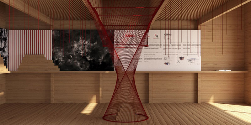 Al centro della stanza, un filo rosso simboleggia un albero, simbolo di vita e di relazioni, per poi svelare, poco a poco, le opere realizzate dai giovani artisti/progettisti.