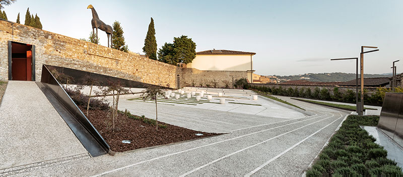 I percorsi sono stati pensati per garantire questa continuità di circolazione pedonale attraverso le aree del complesso senza comprometterne la necessaria indipendenza funzionale. Un secondo varco, oltre a quello già esistente sul muro del cavallo, traduce questa continuità attraverso un elemento architettonico che dialoga con le due diverse facce del muro ed offre al visitatore una nuova prospettiva.