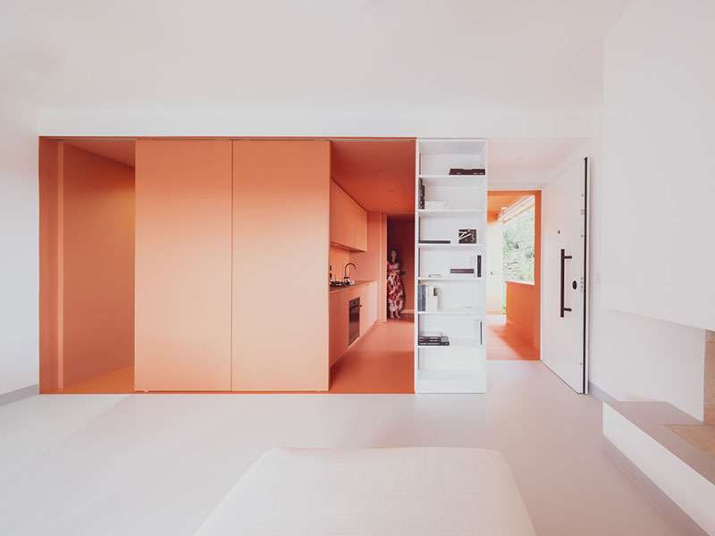 A modulare dinamicamente questo gioco spaziale due elementi fondamentali: quattro porte scorrevoli a tutta altezza che limitano le tre aree e consentono differenti configurazioni, dando la possibilità di chiudere i diversi ambienti o lasciarli aperti open space. E il colore, un mattone tenue, che penetra dallʼesterno allʼinterno investendo pavimenti, soffitti, pareti e infissi.