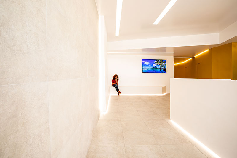 Una parete spezzata - che dalla hall si sviluppa in profondità definendo una promenade, una direzione prospettica - definisce l'approccio compositivo, partendo dalla piccola piazza d'ingresso fino ai vari ambienti per la logopedia che si aprono via via, fino alla sala polifunzionale. Quest'ultima, attraverso il diverso modo di assemblare tavoli e sedie, può diventare sala conferenze, sala riunioni e sala per trattamenti individuali attraverso computer disposti lungo le pareti.
