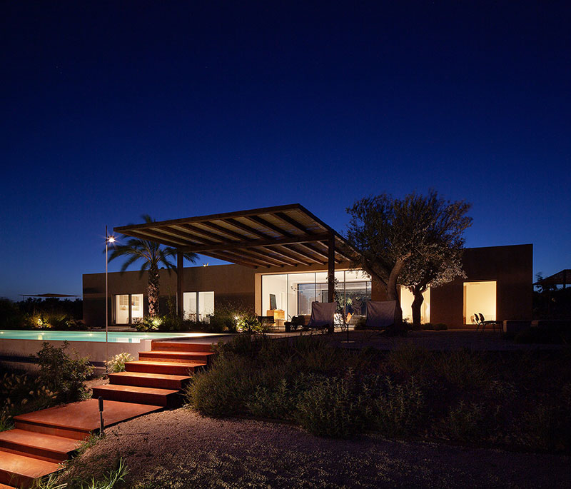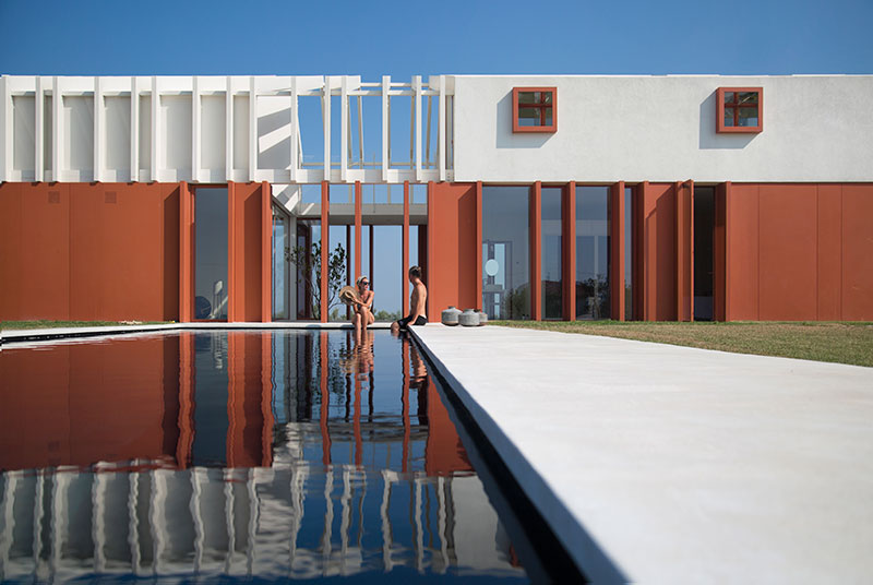 Il risultato è un'architettura essenziale, minimale, che usa il quadrato come geometria compositiva, dove ogni cosa è studiata nei minimi particolari: le proporzioni, gli allineamenti, le viste prospettiche e i punti di fuga. Come la lunga piscina a sfioro, che, correndo parallela alla casa, si perde nella vastità della costa.