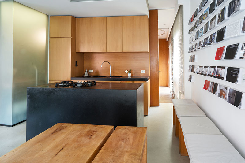 Per questo lo spazio domestico è stato suddiviso in tre aree: la prima a Sud, che ospita il soggiorno-pranzo e duplica la dimensione della veranda esterna pergolata; la seconda a Nord che ospita la camera da letto principale e il bagno, e la terza, tra le due, articolata attorno ad un dispositivo dʼarredo in legno laccato che ospita cucina, armadiature e una libreria con scrivania e che nasconde un letto a ribalta.