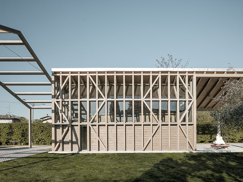 Il legno, i suoi controventi e i dettagli di ancoraggio delineano l'esterno del volume in modo omogeneo estendendosi fino al grande porticato non coperto di ingresso, un sorta di diaframma per appoggiare e collocare le grandi lastre che arrivano dalle cave.
