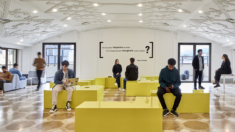 Dalla libertà compositiva di sedute gialle sparpagliate nella lobby comune che, ricomposte, formano la parola LIBERTY, alla fontana che nella terrazza esterna sgorga incessantemente acqua su un pavimento blu. O la differenziazione dei corridoi, delle finestre, delle porte di ingresso e delle camere, tinteggiati ognuno da colori differenti suddivisi per piano.
