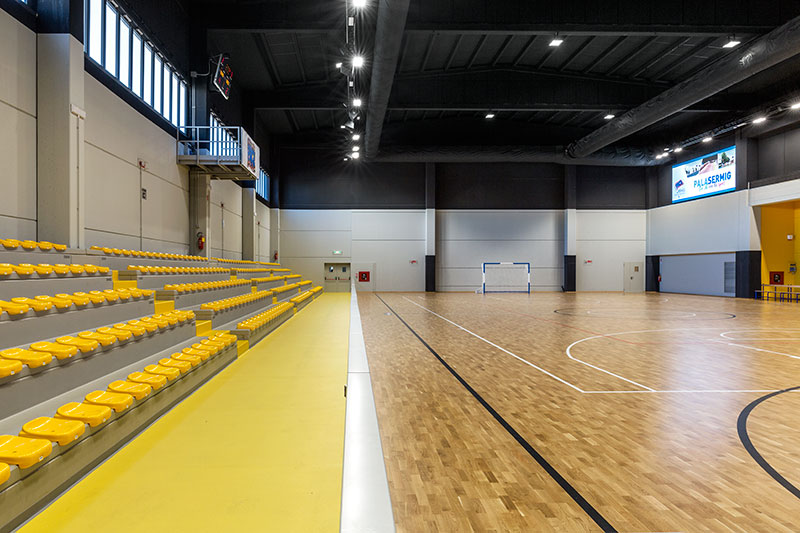 Il nuovo volume, infatti, è plasmato in un corpo compatto, aperto verso valle e caratterizzato da un lungo shed che evidenzia all'esterno le tribune interne. I due ambienti principali sono caratterizzati da grande flessibilità d'uso e consentono lo svolgimento di numerose attività sportive.