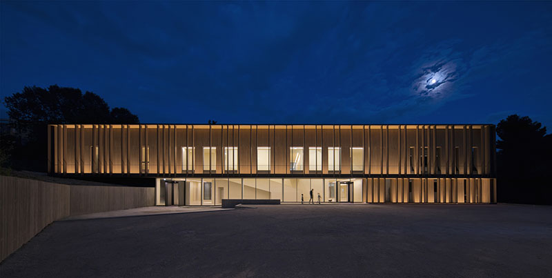 La percezione d'insieme è completamente trasformata: la facciata del nuovo edificio è scandita da una serie di elementi frangisole verticali in larice lamellare che creano una sorta di filtro in continuità con l'ampliamento. Ma, al contempo, mettono l'istituto Zooprofilattico - che si occupa di igiene e sanità pubblica veterinaria oltre che di controllo del sistema produttivo agro-alimentare - in rapporto con la natura e con gli elementi che la costituiscono.
