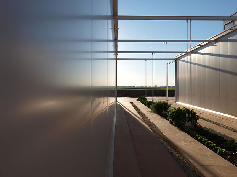I fronti degli edifici si smaterializzano incorporando l'orizzonte, dove una 'galleria agricola' coltivata s'incunea tra i corpi di fabbrica e traguarda il paesaggio, moltiplicandone i piani percettivi. Così, l'insediamento è inciso sull'asse mediano da un cannocchiale visivo verso la campagna.