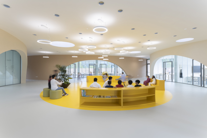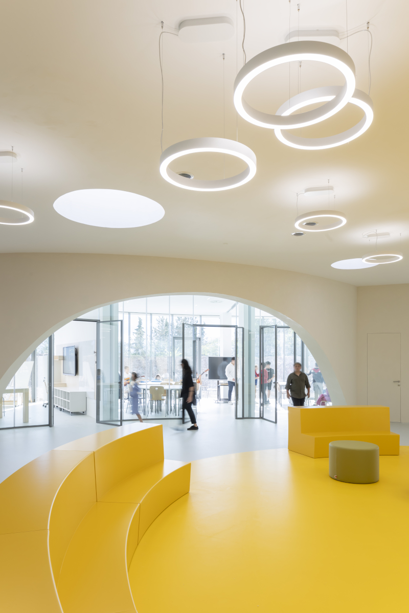 Tutti gli ambienti didattici si sviluppano attorno all'agorà centrale e sono definiti da grandi pareti curve, trasparenti e scorrevoli che li rendono ampiamente flessibili e rimodulabili sulla base delle esigenze quotidiane della vita scolastica. Gli interni, inoltre, sono pensati per essere costantemente in dialogo con l'esterno grazie alla presenza di ampie vetrate continue che si affacciano sul panorama appenninico circostante. Il nuovo polo scolastico è dotato, inoltre, di una mensa progettata a vista e delimitata da vetrate per essere un atelier del cibo, così da promuovere l'apprendimento e diffondere una cultura gastronomica tra i giovani studenti.