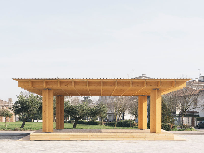 Il padiglione è in legno lamellare e acciaio, realizzato su plinti in calcestruzzo armato. Ha pilastri cruciformi e un sistema di travi, sempre in legno lamellare. È dotato di illuminazione notturna ed è già stato predisposto un piano di manutenzione per il legno. È concepito per accogliere una vasta gamma di momenti di socialità e spettacoli, e si presta anche a valorizzare la storica tradizione musicale della città veneta.