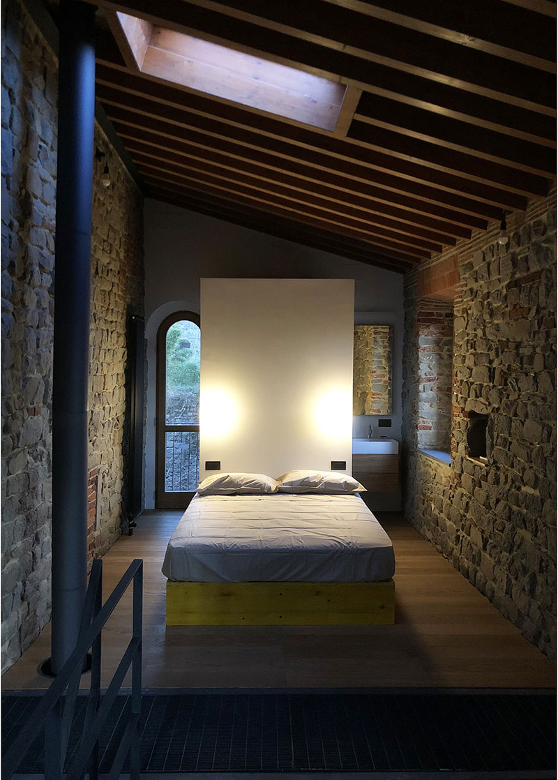 Acquistata sottoforma di rudere, con tetto, pareti e solai crollati, il progetto si lascia ispirare dal concetto di "vuoto", favorendo l'ingresso della luce attraverso l'eliminazione di tutte le pareti che lascia, quindi, visibili tutti i locali. All'interno di questo vuoto, circondato dalla scala e dalla passerella di collegamento tra livelli, trova spazio un cubo sospeso, rivestito completamente in legno di rovere accoglie al suo interno la camera, sotto trova spazio la cucina e sopra, al secondo piano, la camera-studio.