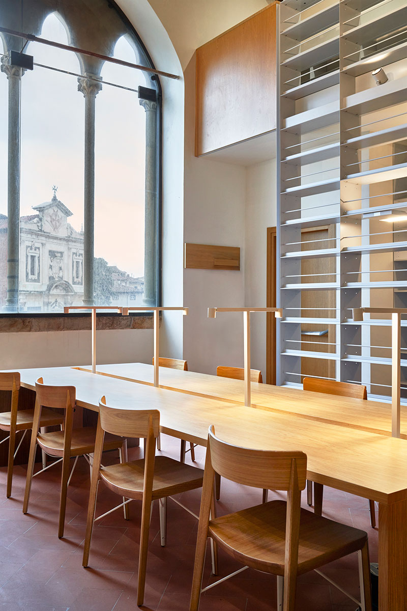 Ne deriva un'architettura organica, cucita su misura, che definisce una nuova identità dello spazio della biblioteca attraverso i due soli elementi principali dell'arredo: le scaffalature librarie, pensate come fondali alle pareti, e gli arredi, pensati come delle isole.