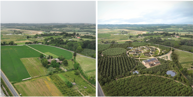 «Abbiamo lavorato con il paesaggio agricolo su scale diverse», spiega Maria Alessandra Segantini. «Alla scala macro - prosegue - abbiamo recuperato il tema dell'arboricoltura (in alternanza di frassini maggiori e pioppi con impianto policiclico multi-obiettivo o misto) che ridisegna un paesaggio che si rigenera naturalmente diventando una risorsa anche economica per il Comune, in linea con alcuni esempi locali e quindi anche facile in termini di gestione». «Il nuovo paesaggio - chiosa - è disegnato da una serie di boschi circolari serviti da sentieri per le manutenzioni e taglio, bacini di raccolta dell'acqua per l'irrigazione e ricoveri per le attrezzature agricole. Tale paesaggio ha permesso di ridare vita agli edifici rurali che mal si adattavano alle vecchie funzioni e che sono stati trasformati in accoglienza con offerta turistica e spazi collettivi per la nuova comunità che abiterà l'area di Santo Stefano».