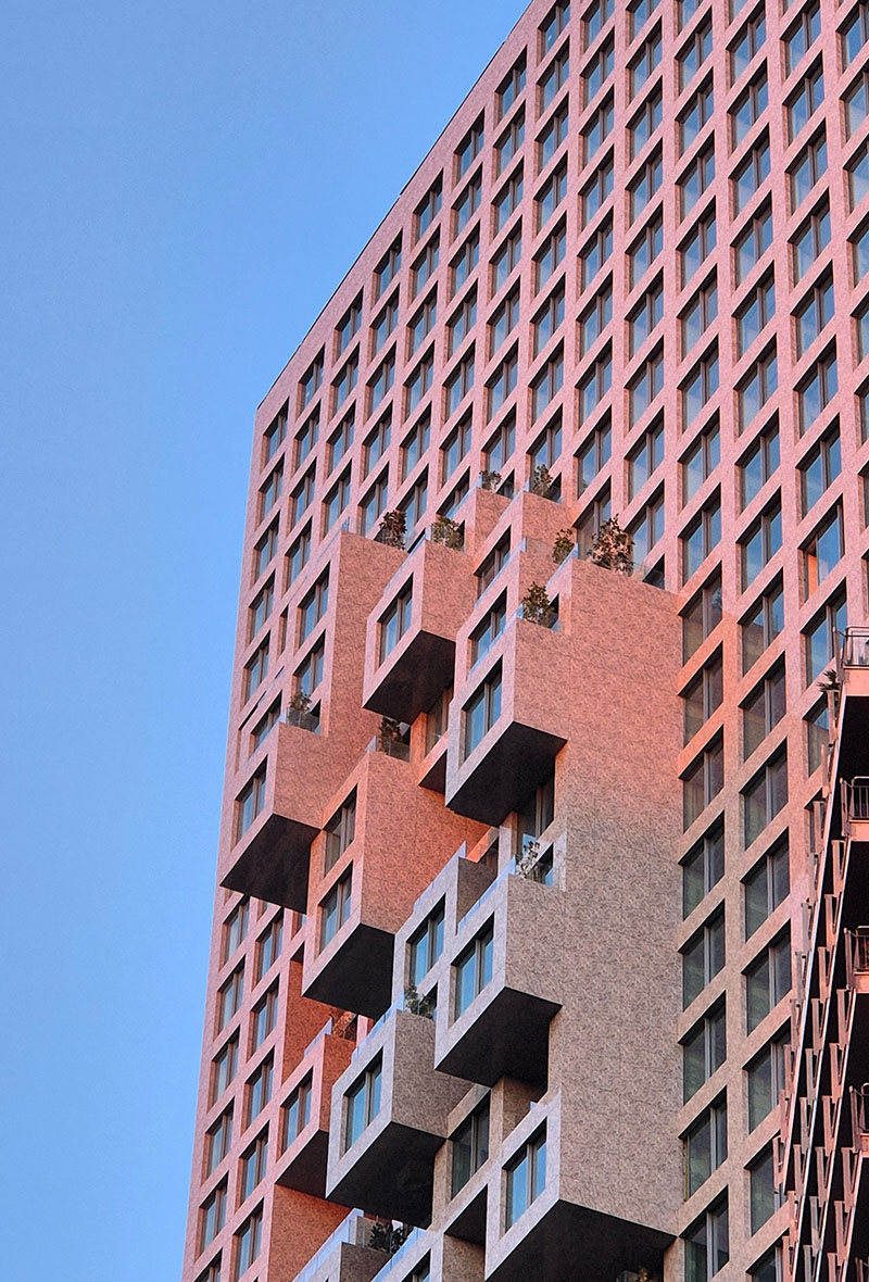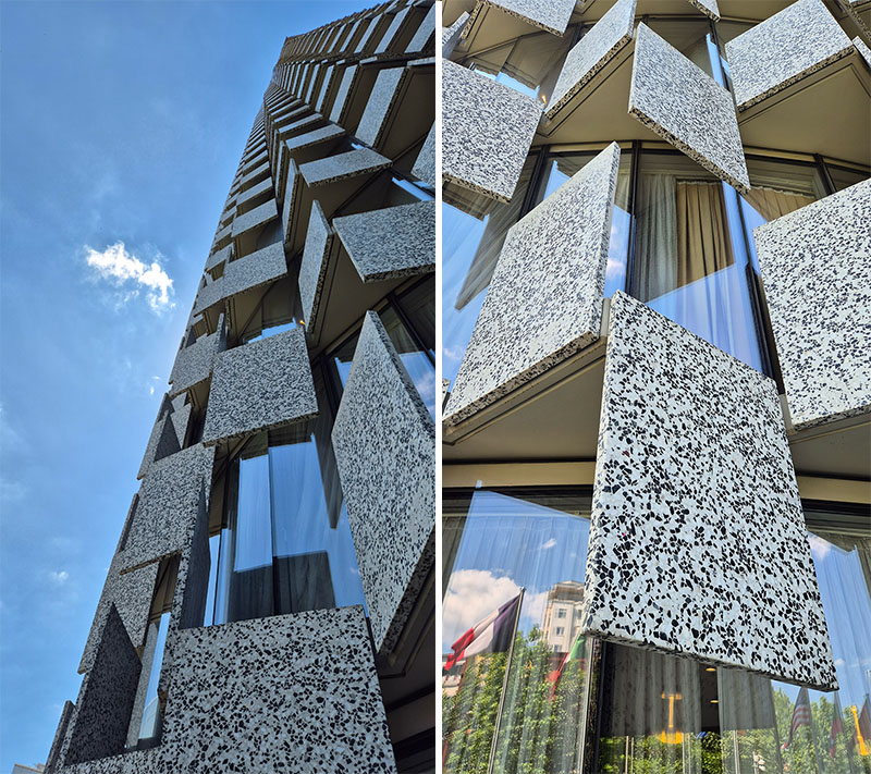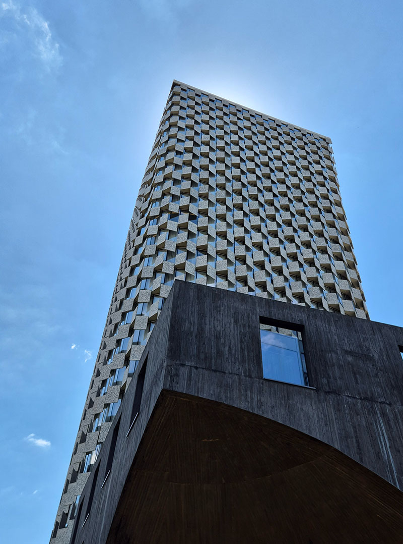 La sua migliore caratteristica? Il rivestimento esterno della torre, un sistema vuoto/pieno di pannelli in graniglia di cemento appesi, che creano un effetto a corolla. Intelligente ed elegantissimo.