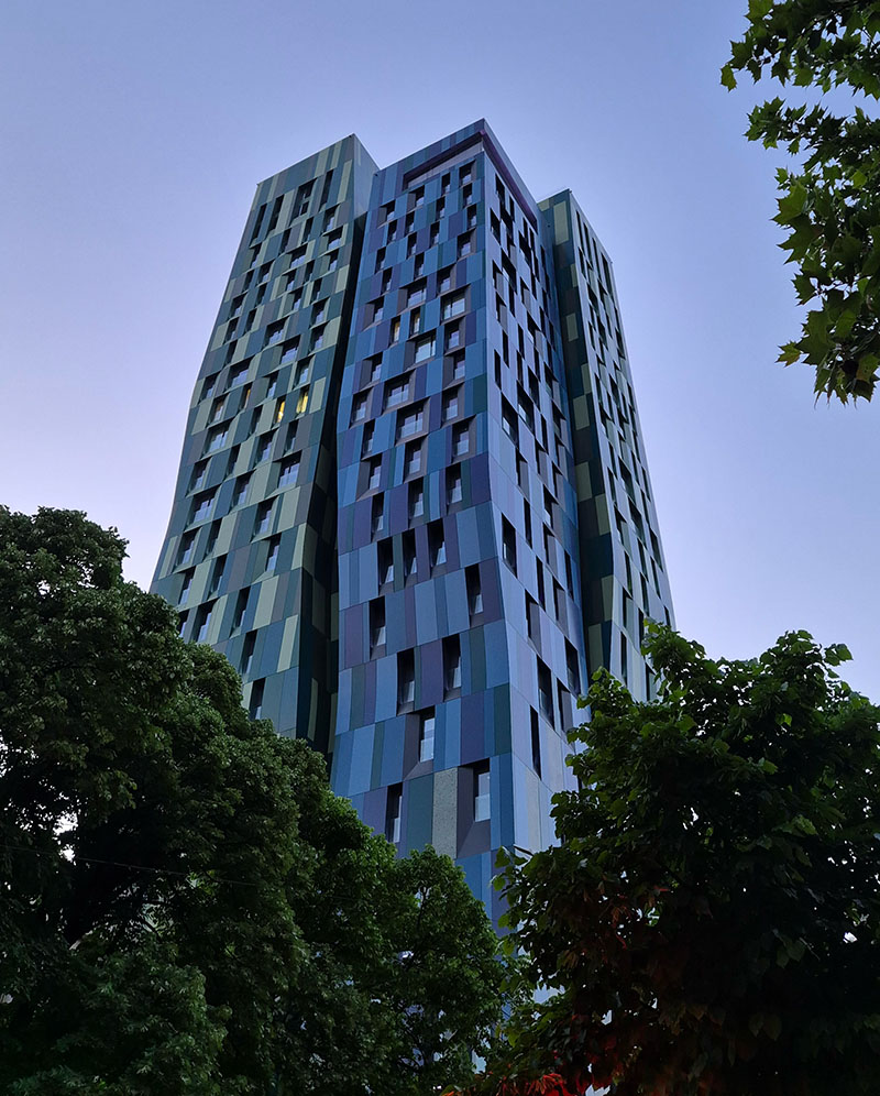 Visibile dal viale principale che entra in città, la torre, terminata dallo studio belga nel 2016 in seguito ad un concorso ad inviti, è concepita come un monolite che, partendo da un’ellisse e terminando con un rettangolo, cattura la luce di Tirana e genera una gamma di ombre inaspettate.
