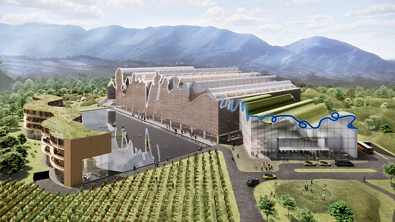 Il complesso è composto da due strutture, servizi di supporto e spazi pubblici. Mentre il centro espositivo mostra la sua silhouette in facciata, l’hotel offre un’immagine più sottile, esprimendo curvature simili in pianta piuttosto che in prospetto. Tra i due, una grande vasca di acqua piovana riciclata riflette entrambe le strutture. Il progetto integra elevati standard ecologici, con materiali e luce naturale, il riscaldamento e il raffreddamento geotermico e tegole solari bianche all’avanguardia per sfruttare tutta l’elettricità. Inoltre, la terra scavata durante la costruzione verrà utilizzata per creare cumuli che fungono da cuscinetti acustici nel tentativo di rinaturalizzare il paesaggio.