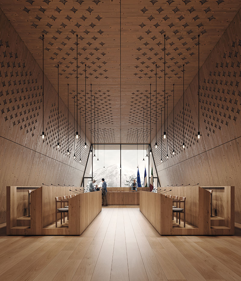 Differentemente, il volume superiore, con le sue geometrie ben visibili e riconoscibili grazie alle falde di copertura rivestite in scandole di legno, dialoga con il paesaggio circostante, dalle vette delle Dolomiti alle falde della Pieve, fungendo da landmark della nuova sede comunale.