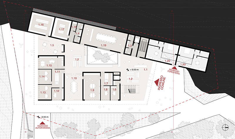 Al piano terra - delimitato sul lato a monte da un volume longitudinale che contiene a sud un blocco servizi e archivi - trovano posto le sale d'aspetto, adiacenti all'ingresso, in diretta connessione con gli uffici.