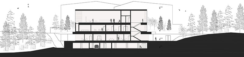 Partendo dalle tracce delle linee generali del volume esistente, il progetto di AM3 immagina il rinnovamento attraverso due elementi iconici che, richiamando la tradizione costruttiva locale, la reinterpreta in chiave contemporanea, contrapponendo il basamento massiccio in calcestruzzo alle tecnologie X-Lam - più leggere - dei volumi superiori.