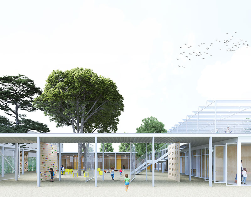 Il perimetro si allontana, così, dall'idea di limite invalicabile, diventando esso stesso un elemento comunicativo e interattivo di scambio visivo e relazionale tra il dentro e il fuori, abitato nel suo spessore da spazi attrezzati per il gioco: tratti più trasparenti si alternano ad altri più chiusi, utilizzando reti e pannelli ludici forati per generare continuità tra istituto scolastico e città, risorsa formativa ed educativa.