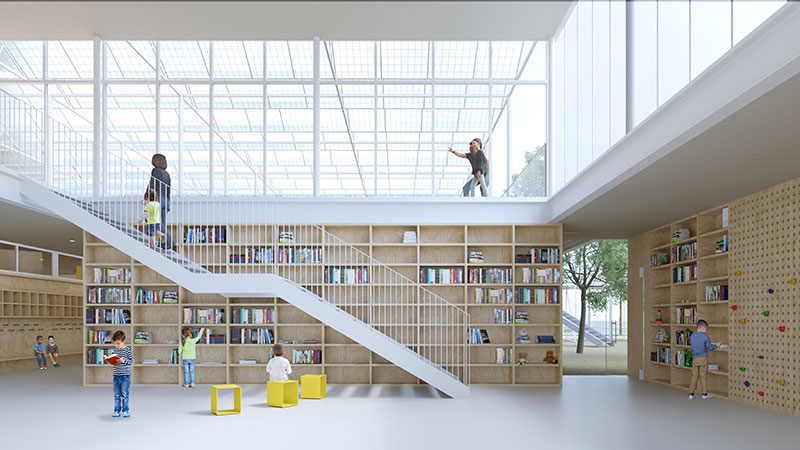 A fianco, un'aula più raccolta, sempre in relazione visiva con il grande atrio, è dedicata alle attività di gruppo e con bambini con diversa abilità. L'atrio centrale è caratterizzato da un doppio volume e ospita i sistemi di risalita che consentono di raggiungere, al piano primo, l'aula informatica/inglese e il laboratorio per attività creative, che si apre interamente sulla parte praticabile di coperto.