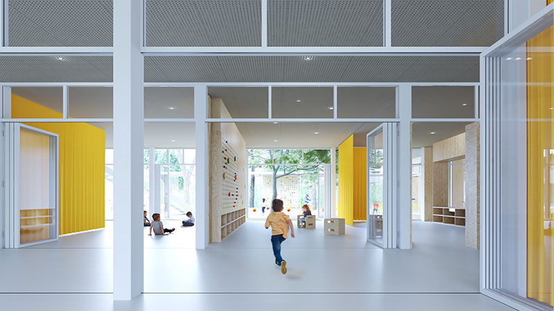Si presenta così il nuovo polo scolastico immaginato dallo studio INOUT Architettura - fondato a Ferrara da Mario Benedetto Assisi e Valentina Milani - in risposta al concorso di progettazione bandito alla fine dello scorso anno dal Comune di Villasanta (MB), che interpellava i progettisti per assicurare un'esperienza immersiva agli alunni della scuola per l'infanzia.