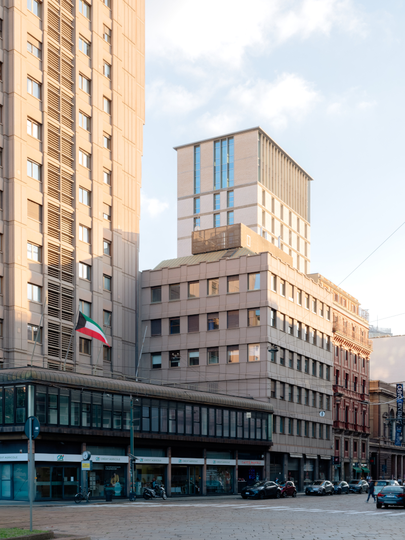 Il fronte vetrato della soprelevazione «richiama la tradizione milanese delle torri del dopoguerra, generando un volume che si pone a coronamento dell'edificio. Le linee di costruzione del prospetto originale vengono riprese ma declinate in chiave contemporanea, con un diverso approccio materico. L'edificio esistente vede l'impiego del cemento martellinato e di un rivestimento in klinker, mentre la nuova volumetria prevede l'utilizzo dell'alluminio anodizzato e di un rivestimento in laterizio a corsi rientranti e sporgenti, a creare un nuovo ritmo nella facciata. Il riposizionamento dell'aggetto del tetto nella parte superiore del nuovo volume sottolinea la coesione tra le due parti».