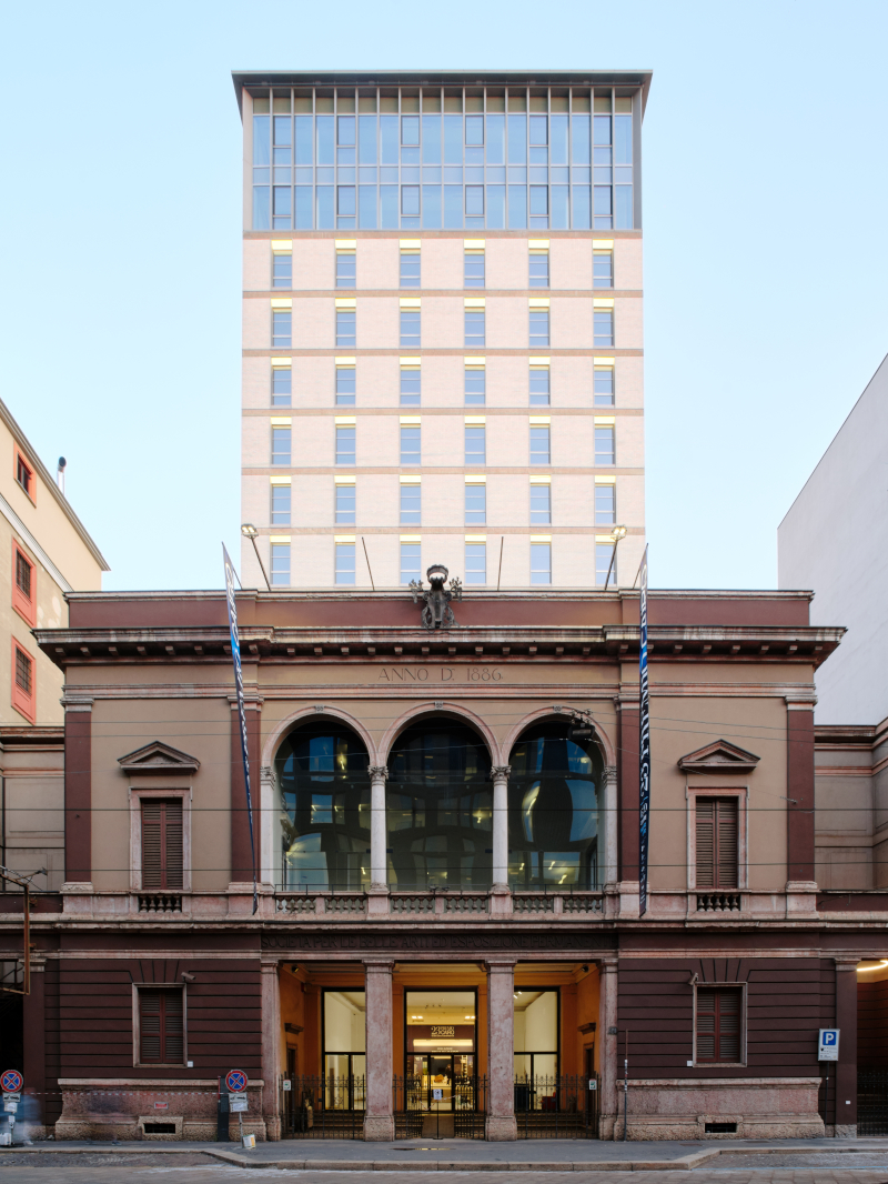 Il Palazzo, che ospita il del museo della Permanente, era nato dalla ricostruzione della sede della società per le belle arti ed esposizione realizzata da Luca Beltrami e danneggiata dai bombardamenti del 1943. Il progetto dei fratelli Castiglioni è costituito da un edificio sviluppato in orizzontale su cui si eleva una torre rientrante rispetto alla superstite facciata di Beltrami.