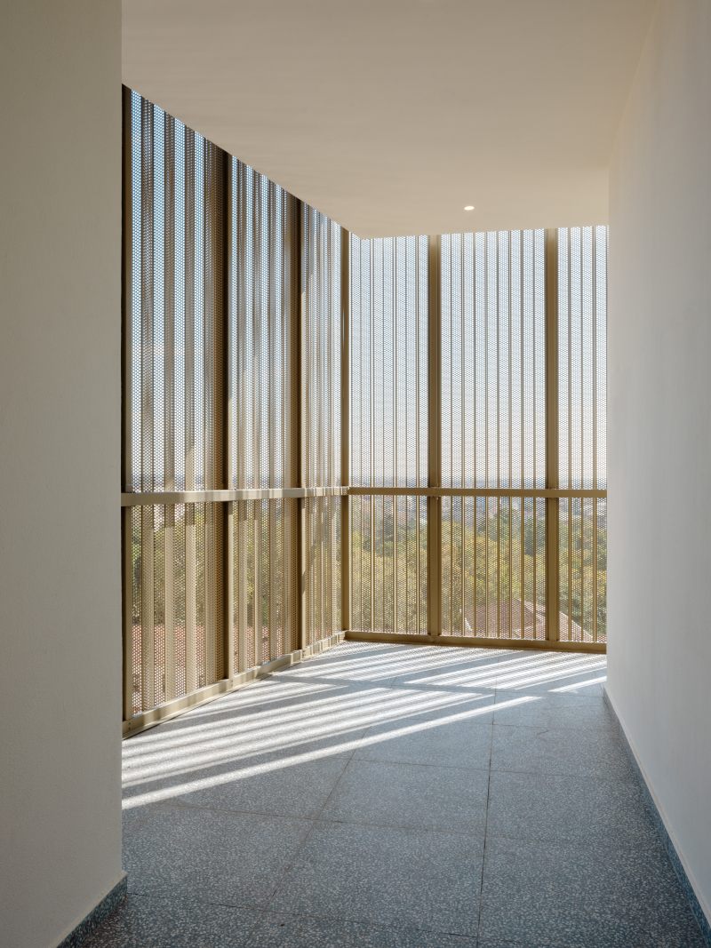 «L'intervento sulla facciata - proseguono i progettisti - esalta la pulizia formale delle linee verticali, rettilinee e parallele, sottolineandone il rigore compositivo. I serramenti vengono arretrati conferendo, grazie alle linee d'ombra più marcate, una maggiore dinamicità alla facciata. L'imbotte esterno, rivestito in lamiera bronzata, riprende la finitura e i toni cromatici del sopralzo. Sulla parte superiore del serramento, infine, è alloggiato un sistema di illuminazione composto da un diffusore Led opalino che, nelle ore notturne, enfatizza la scansione ritmata del prospetto principale. Sul fronte interno della torre, il blocco delle risalite e i ballatoi sono rivestiti in lamiera stirata microforata color bronzo, richiamando le cromie e le finiture del sopralzo e delle imbotti delle finestre».