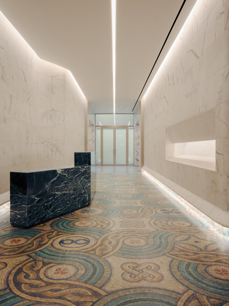 «La riqualificazione della hall, anch'essa di grande pregio architettonico, sottolinea i dettagli originali grazie alla rimozione delle superfetazioni successive al progetto degli anni Cinquanta. La decorazione a mosaico del pavimento viene così riportata alla luce, così come le gole che contengono una fonte luminosa direzionata verso lo stesso. Il nuovo sbarco ascensori viene contestualizzato con finiture e rivestimenti in linea con la preesistenza».