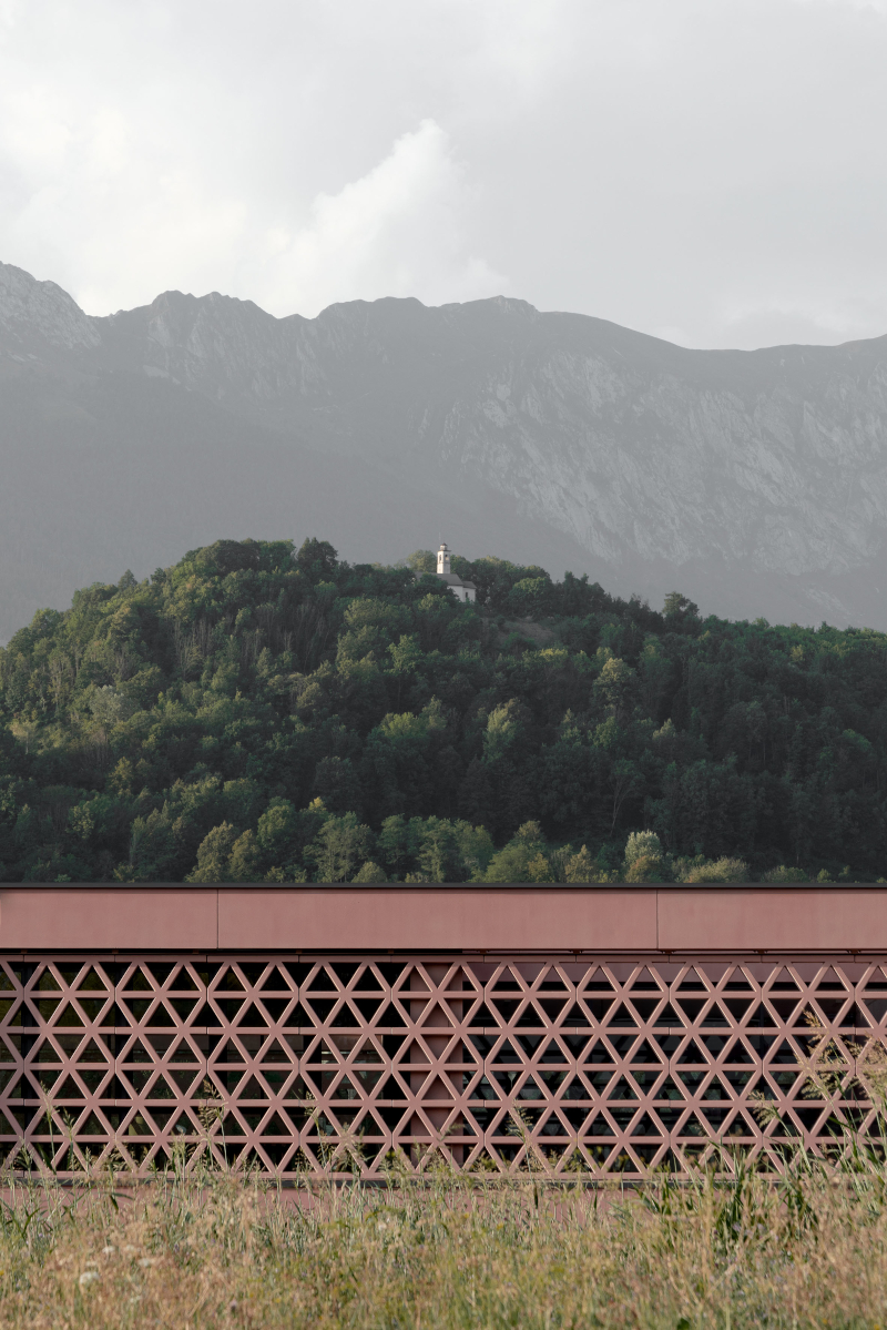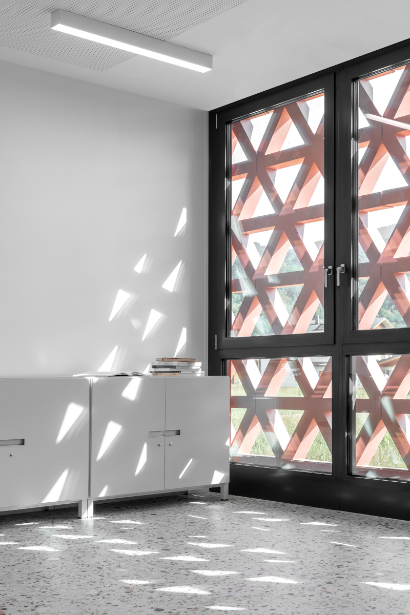 Alcuni elementi elementi architettonici sono pensati per generare atmosfere diverse, che cambiano con lo scorrere del tempo e delle stagioni. In particolare lo spazio centrale è caratterizzato dalla presenza delle gelosie: frangisole formati da pannelli prefabbricati in calcestruzzo con una trama a fori triangolari che riprendono, seppure ad una scala maggiore, i motivi reticolari in mattone tipici dei fienili della Valbelluna.