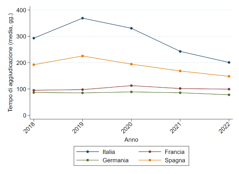 In Italia i tempi medi di aggiudicazione delle gare di appalto sono di 279 giorni contro gli 84 della Germania. Nel mezzo la Francia con 102 giorni e la Spagna con 180. I dati derivano dal report elaborato dall'Anac che ha analizzato i dati delle gare espletate secondo il criterio dell'offerta economicamente più vantaggiosa, pubblicate sulla piattaforma della Commissione europea, Tenders economic Daily per il periodo 2018-2022.