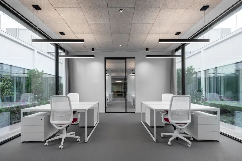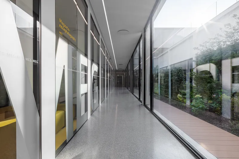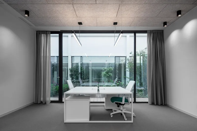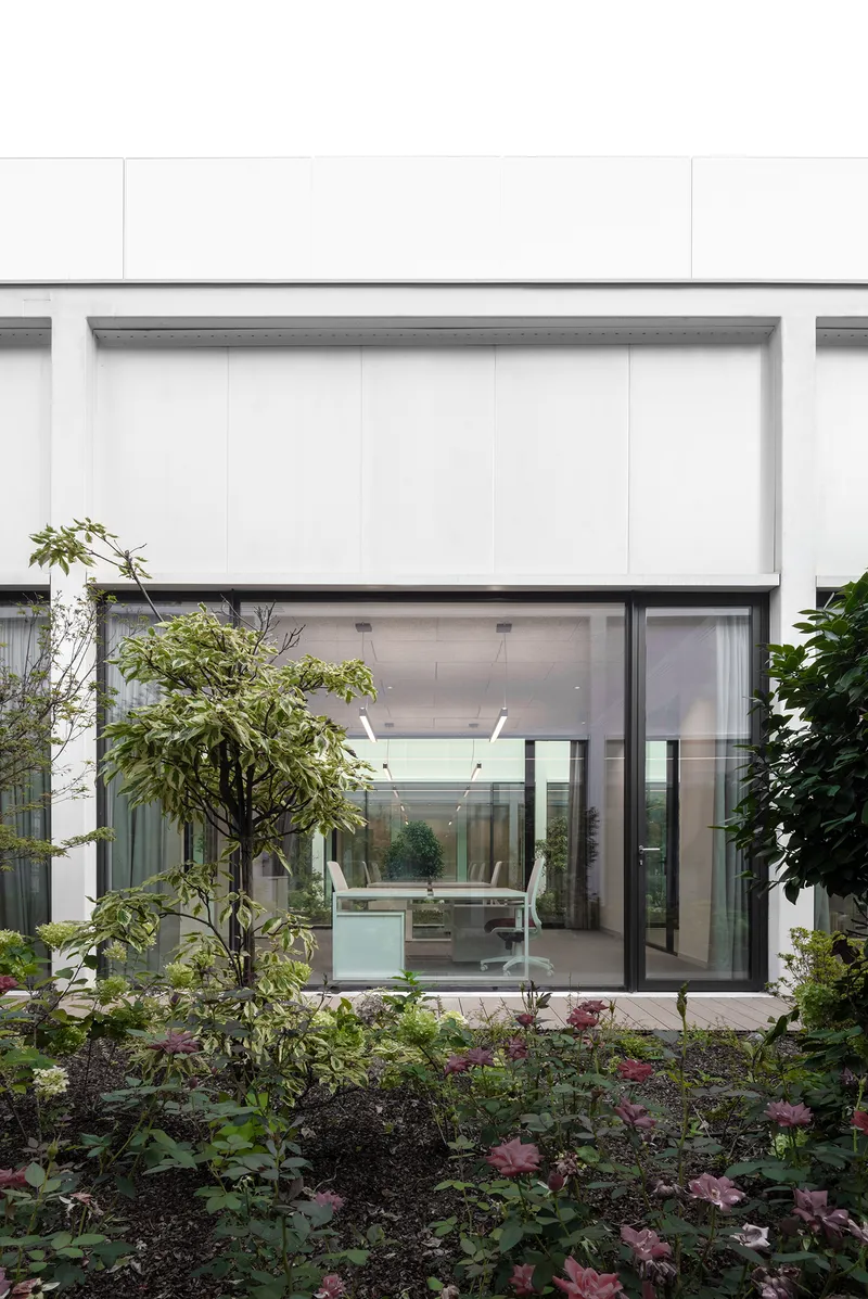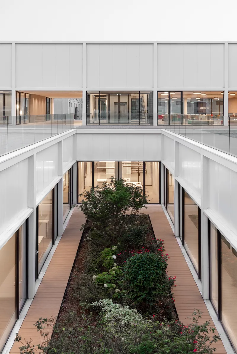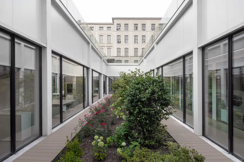 Due patii a cielo aperto, che portano aria e luce naturale agli spazi comuni collocati nel piano interrato, compongono una sorta di "chiostro contemporaneo" che connette, attraverso collegamenti pedonali e tunnel sotterranei, i nuovi laboratori con gli edifici storici esistenti.