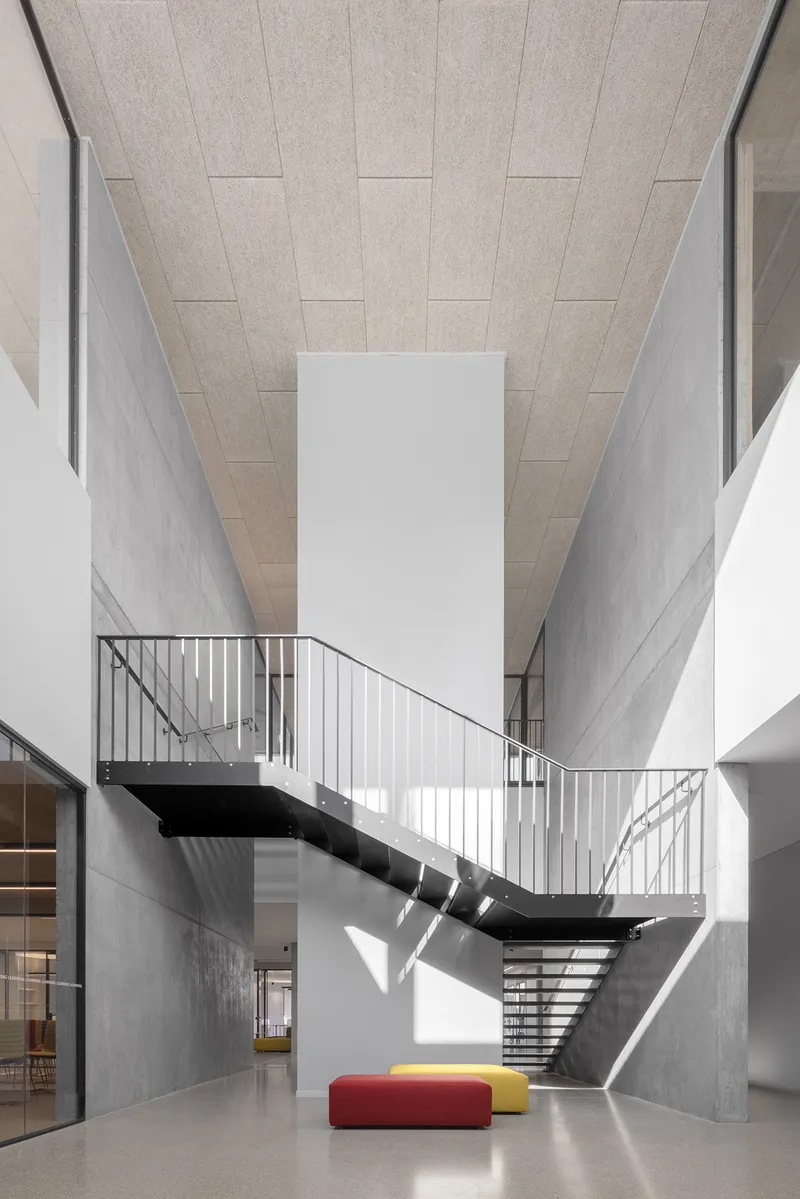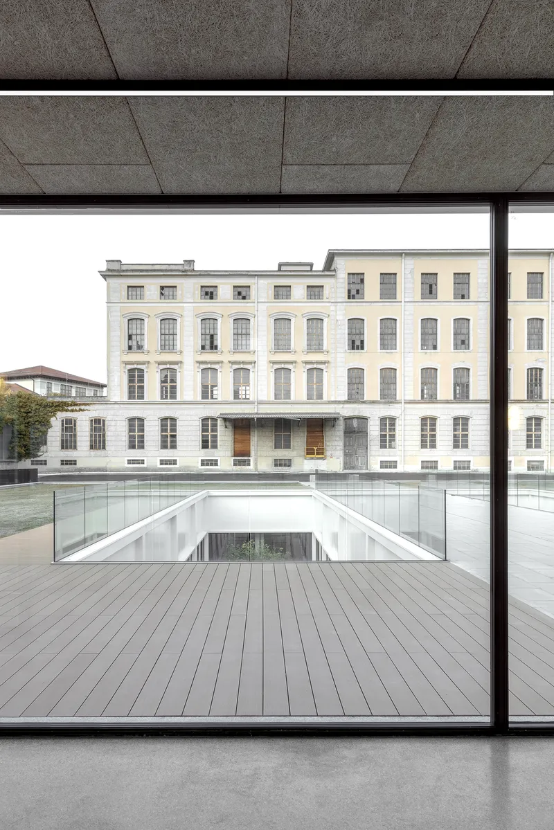 Il volume invece, caratterizzato dall'utilizzo di cemento, acciaio e vetro, richiama l'atmosfera industriale del complesso, con una griglia di prospetto a intervalli regolari che rimanda al ritmo delle lesene delle facciate ottocentesche circostanti.