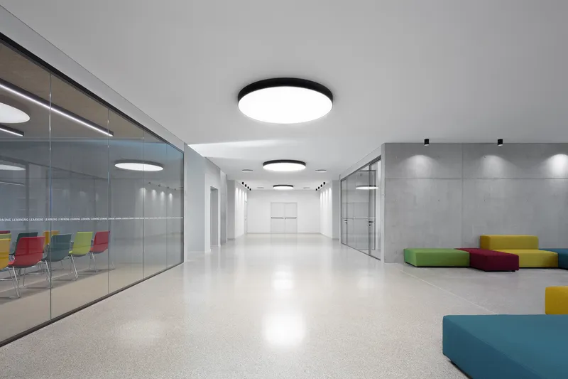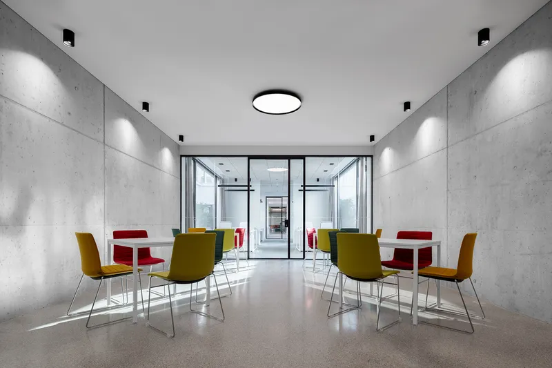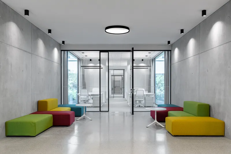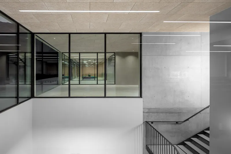 Con linee pulite e colori neutri, i laboratori si inseriscono nel complesso storico - vagamente neoclassico - sviluppandosi prevalentemente in ipogeo, così da ottenere migliori condizioni per gli esperimenti grazie alla minore quantità di luce, suoni e campi magnetici che potrebbero interferire con le attrezzature tecniche.