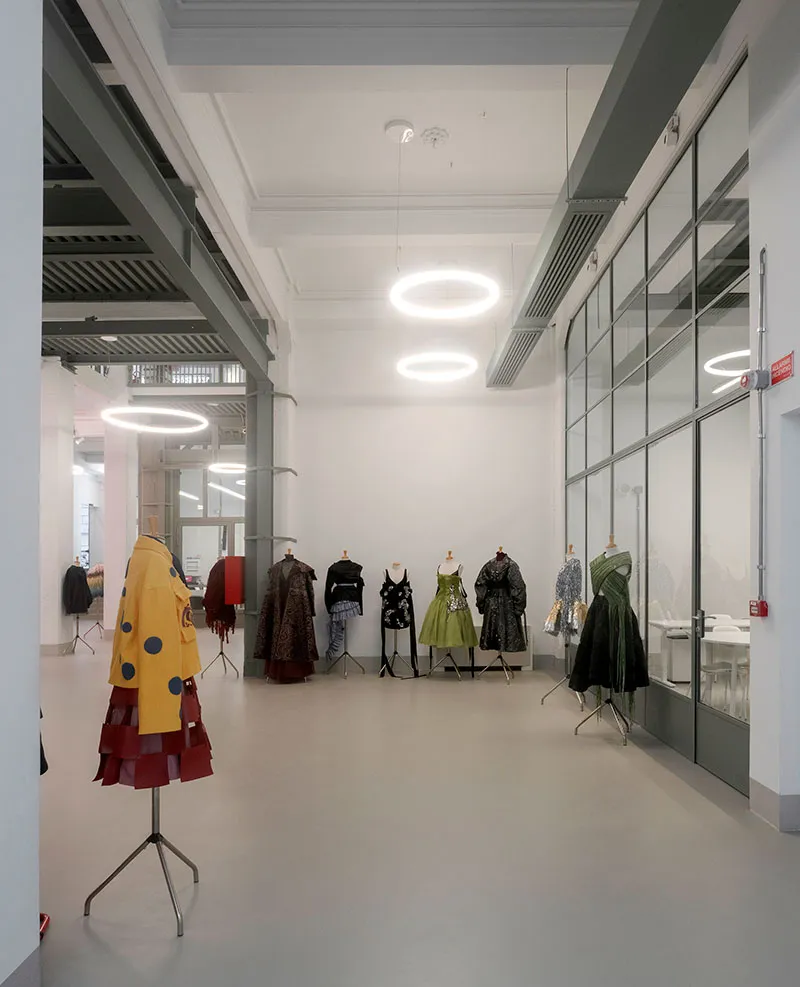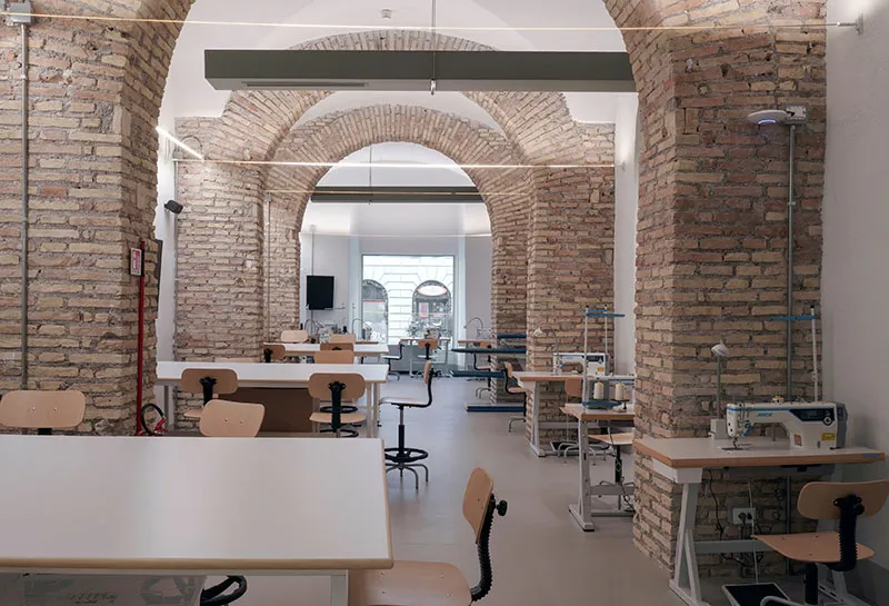 Un luogo inclusivo e multiculturale - come il quartiere su cui insiste - dove si incontrano tradizione e innovazione, tecnologia e alta artigianalità. Uno spazio fluido, con aule completamente digitalizzate, che offre un ambiente di apprendimento d'avanguardia: così la nuova sede (la seconda romana, dopo la storica in via della Rondinella dove rimarranno i master) ospita la sua community in 1100 mq di aule informatizzate, 1000 mq di laboratori di Moda, Accessori, di Costume, Sartoria, Prototipia e Modellistica, Fotografia e Styling, e nei nuovi spazi dedicati alla biblioteca e alla tessuteca. Continuando, 250 mq di terrazze e il rooftop che potranno essere utilizzate come spazi ricreativi, di condivisione e di apprendimento. E, non subito, dotati di un bar panoramico aperto al pubblico.