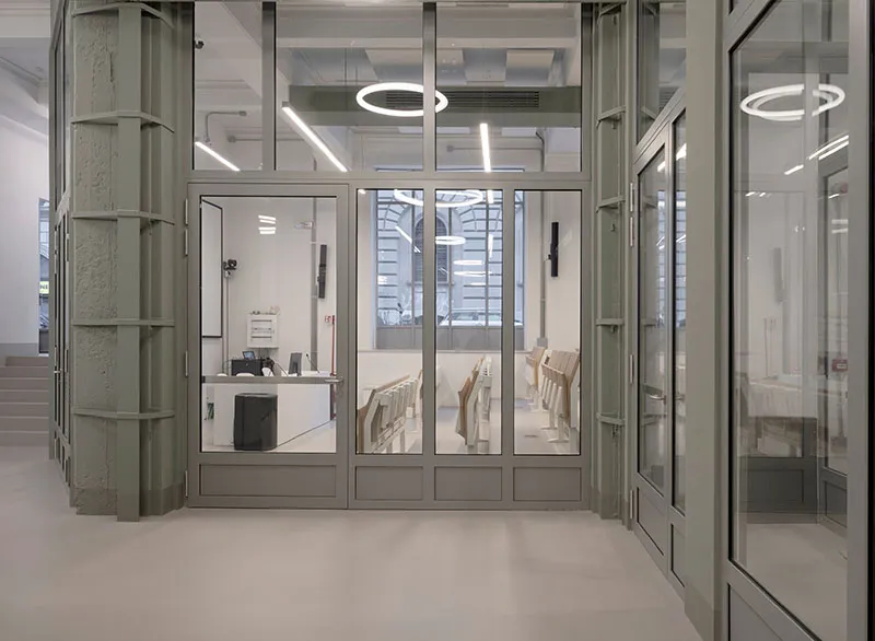 Per questo, gli elementi storici della parte umbertina (piano terra ed interrato) sono stati preservati, recuperati e valorizzati, con un'attenzione particolare alla loro consistenza materica ed estetica, resa evidente attraverso un'esposizione a vista delle strutture esistenti.