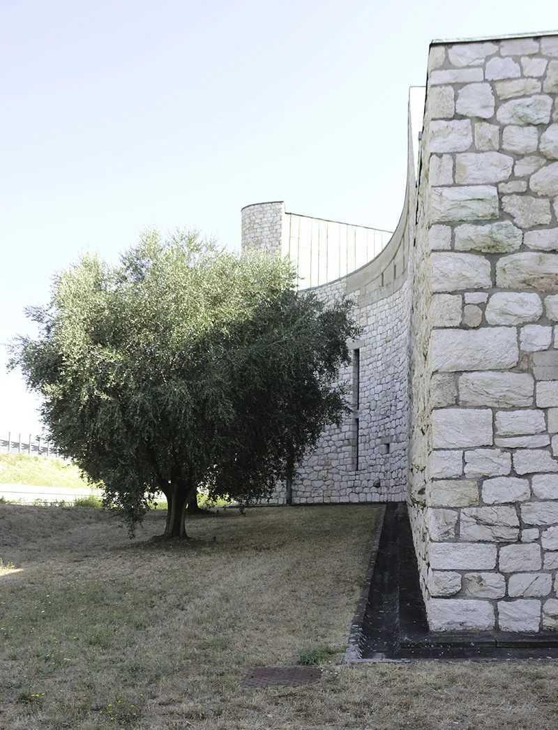 Qui, rispetto alla stazione di Firenze sentiamo un pathos più palpabile, grazie anche alle sculture di Emilio Greco e all'ausilio di quelle silenziose "stanze" di verde dove abitano alcuni ulivi del piccolo giardino laterale alla maniera di un moderno hortus conclusus.