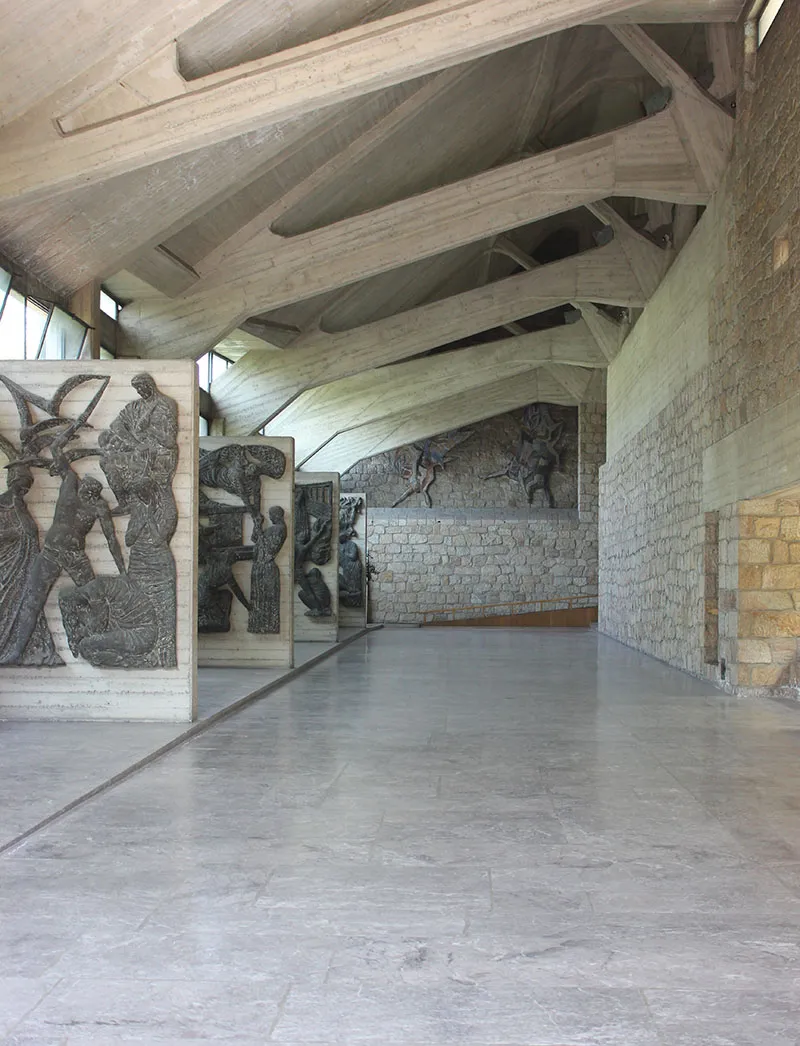 Il percorso dopo alcuni gradini conduce alla grande aula della chiesa che è un tripudio di verticalità e dove la coesistenza di calcestruzzo e pietra rosa di San Giuliano che caratterizza anche gli esterni raggiunge il suo apice di naturalezza.