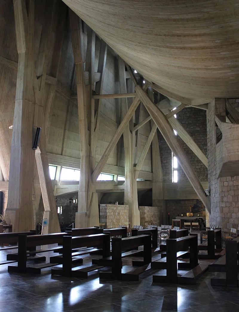 All'interno dell'aula sembra di stare dentro un guscio, un ventre teso di cemento armato che si alza verso il cielo nella tensione dei pilastri verticali. La complessa planimetria può essere letta come la rielaborazione moderna di una basilica paleocristiana così come la presenza del matroneo, elemento fondamentale della tradizione liturgica cristiana nel mediterraneo. Il cerchio poi si chiude attraverso un camminamento che permette, passando per il battistero curvilineo, a sud-ovest di ritornare sul sagrato.