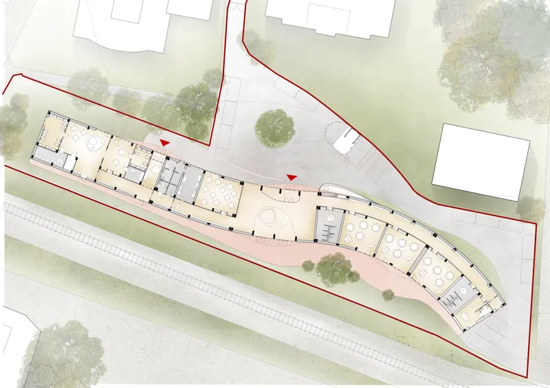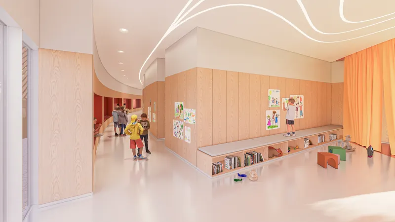 All'interno della scuola, concepita come un'unica entità a sviluppo lineare, un ampio corridoio funge da elemento unificante, rappresentando il percorso di crescita dei bambini. L'elemento di connessione orizzontale culmina nel cuore dell'edificio - la piazza coperta - che ospita le attività di laboratorio, circondata da vetrate che inondano l'area di luce naturale e si connette alla mensa e agli spazi esterni.